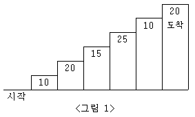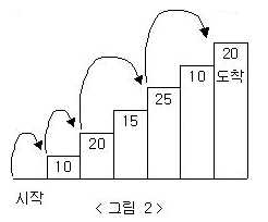 예를 들어 <그림 2>와 같이 시작점에서부터 첫 번째, 두 번째, 네 번째, 여섯 번째 계단을 밟아 도착점에 도달하면 총 점수는 10 + 20 + 25 + 20 = 75점이 된다.