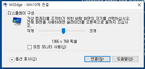 Hyper-V에서 가상 머신을 실행할 때 해상도를 크게 설정하고 설정 저장을 했더니, 이후에는 설정 창이 안나타난다.