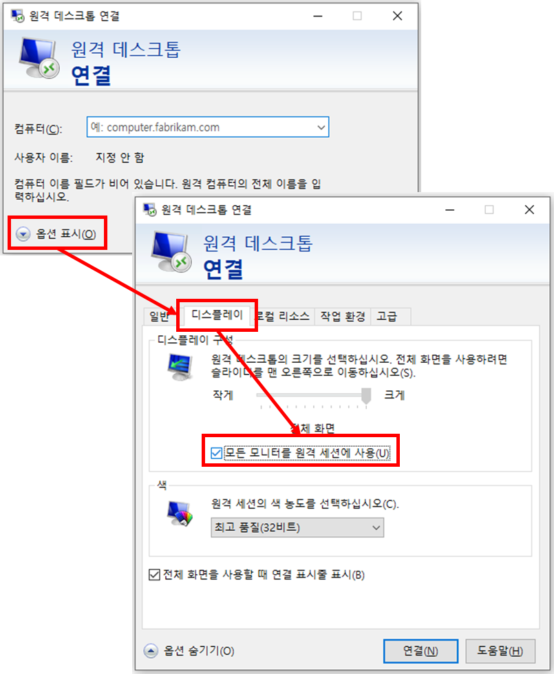 듀얼 모니터로 원격 연결을 하고 싶다.